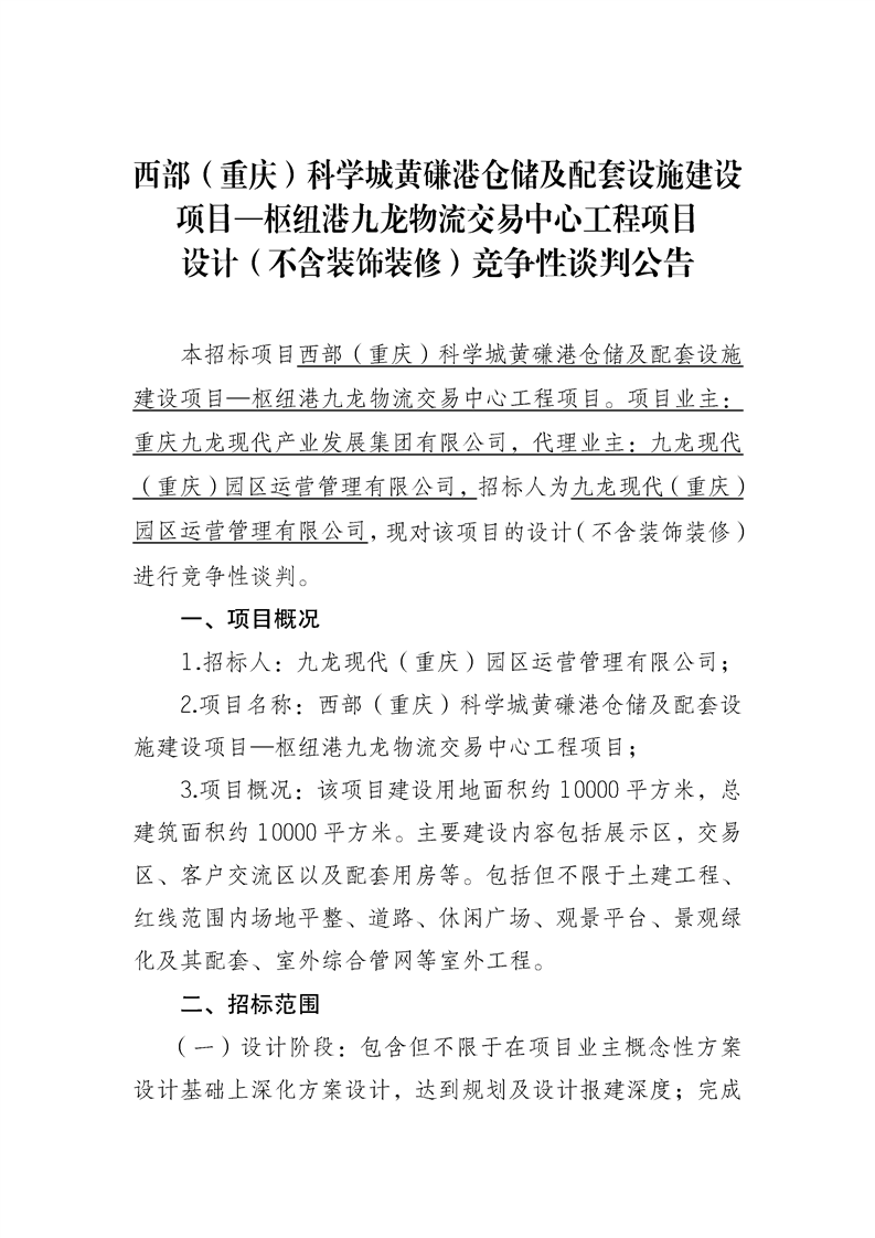 西部(重庆)科学城黄磏港仓储及配套设施建设项目—枢纽港九龙物流交易中心工程项目设计(不含装饰装修)竞争性谈判公告