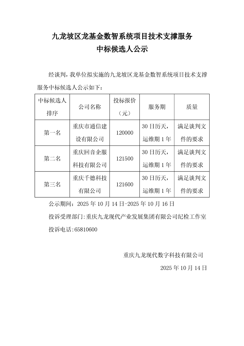 九龙坡区龙基金数智系统项目技术支撑服务中标候选人公示