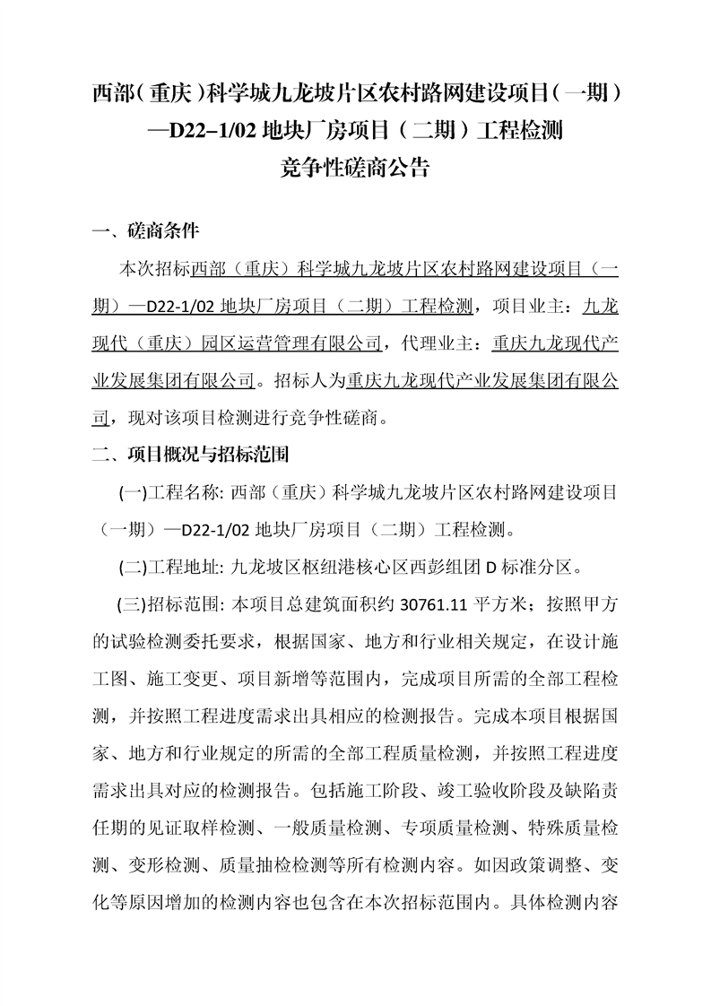 西部(重庆)科学城九龙坡片区农村路网建设项目(一期)—D22-1/02地块厂房项目(二期)工程检测竞争性磋商公告