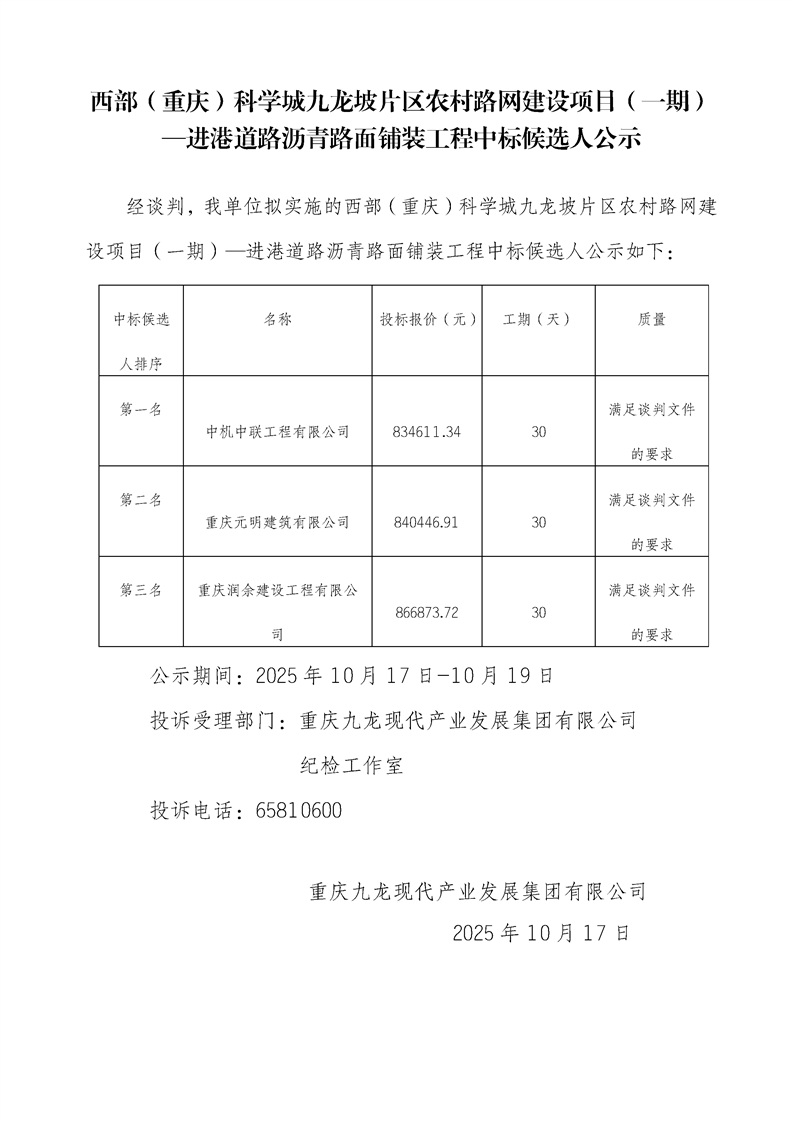 西部(重庆)科学城九龙坡片区农村路网建设项目(一期)—进港道路沥青路面铺装工程中标候选人公示