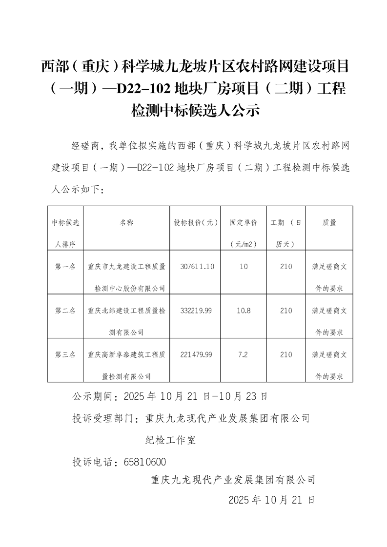 西部(重庆)科学城九龙坡片区农村路网建设项目(一期)—D22-102地块厂房项目(二期)工程检测中标候选人公示