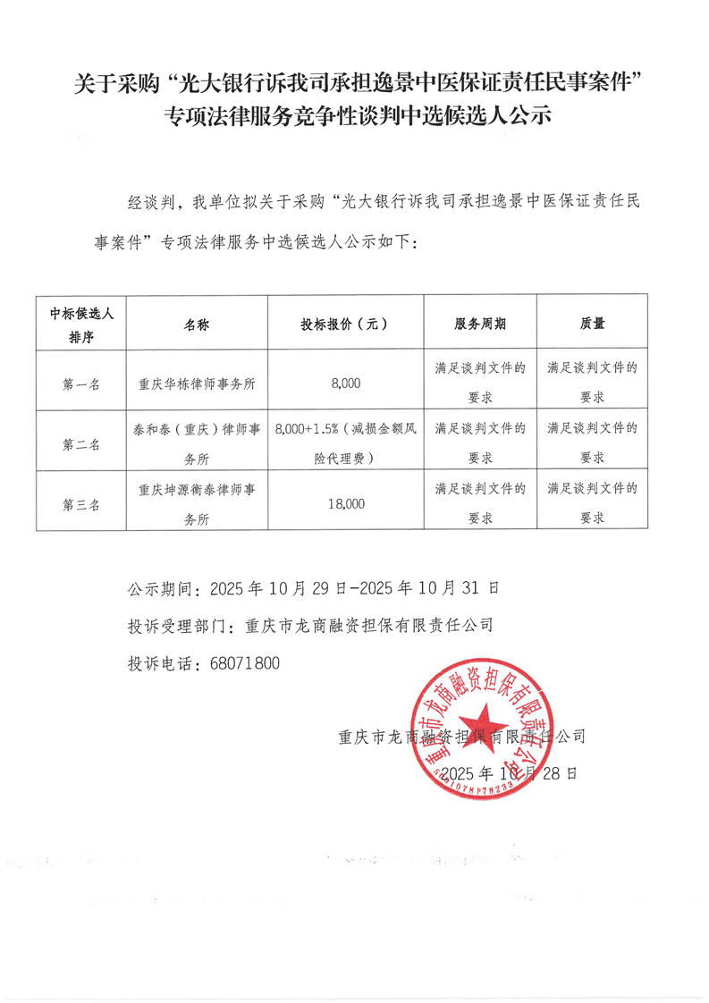 关于采购“光大银行诉我司承担逸景中医保证责任民事案件”专项法律服务竞争性谈判中选候选人公示