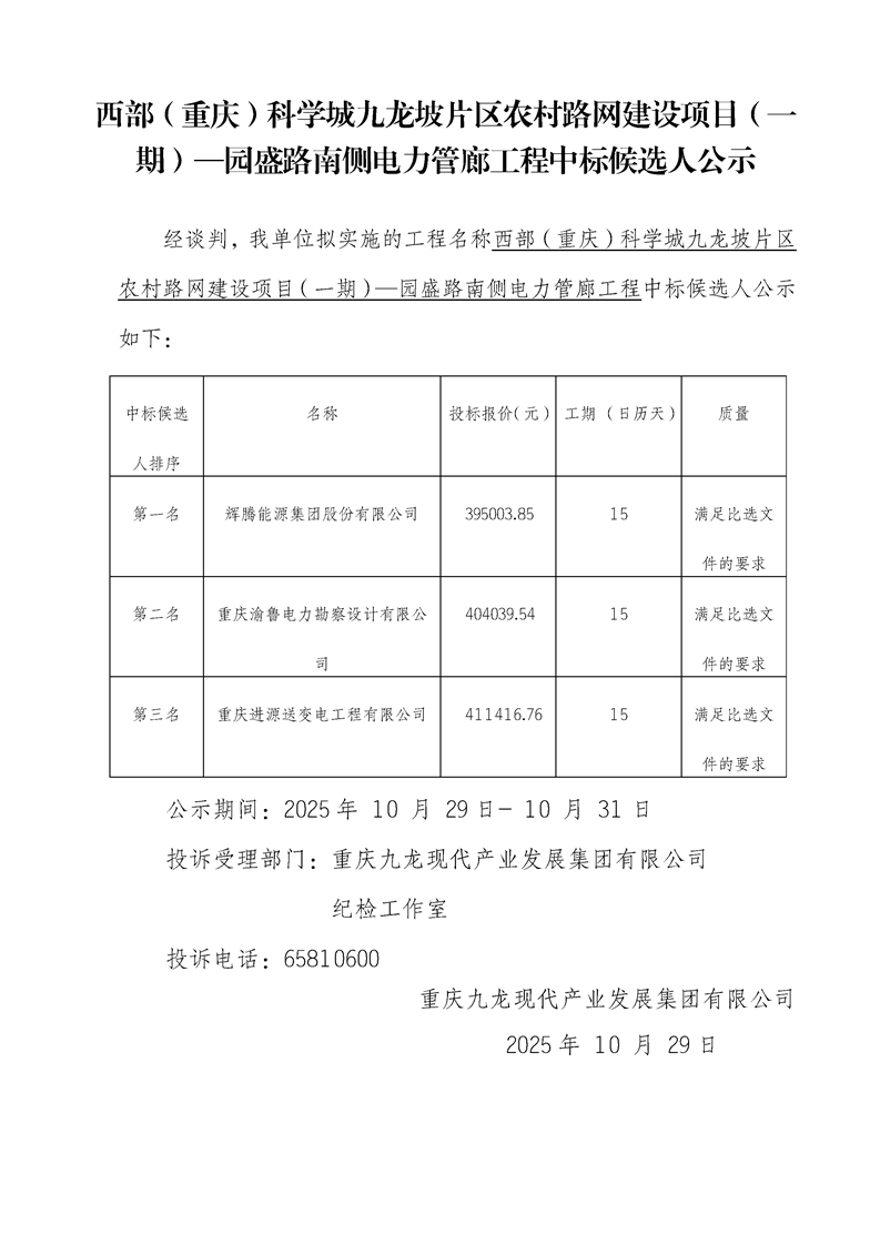 西部(重庆)科学城九龙坡片区农村路网建设项目(一期)—园盛路南侧电力管廊工程中标候选人公示