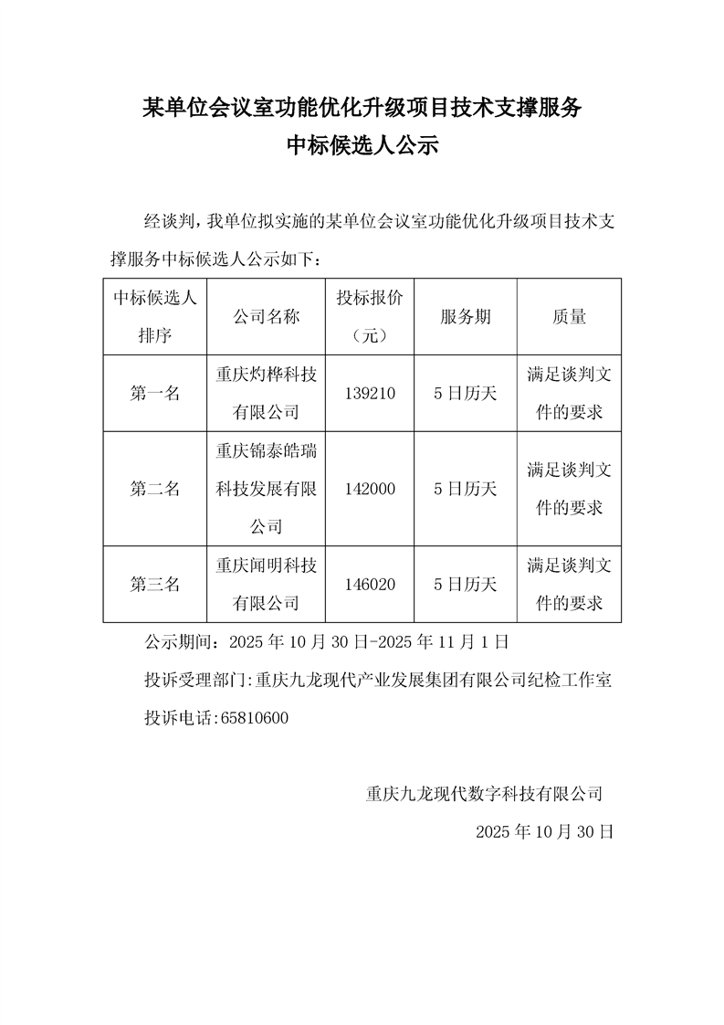 某单位会议室功能优化升级项目技术支撑服务中标候选人公示