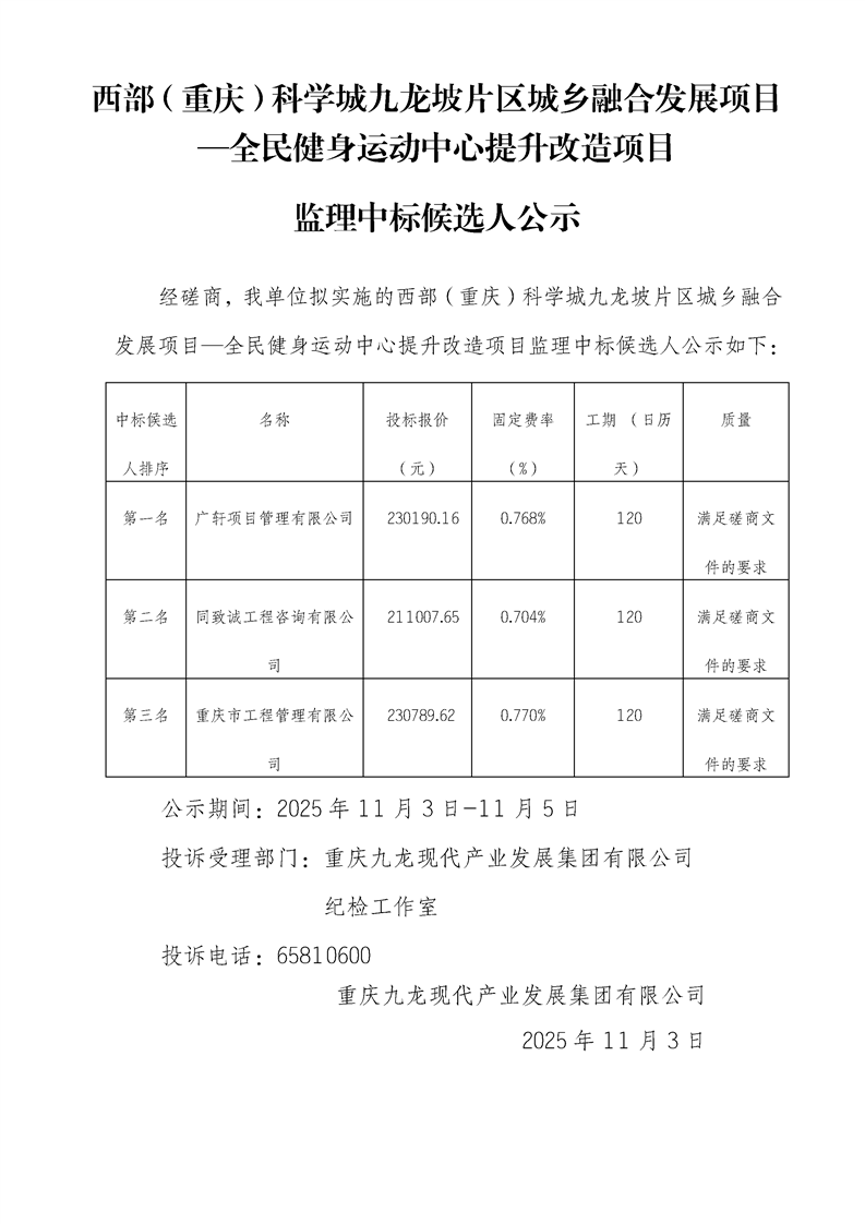 西部(重庆)科学城九龙坡片区城乡融合发展项目—全民健身运动中心提升改造项目监理中标候选人公示