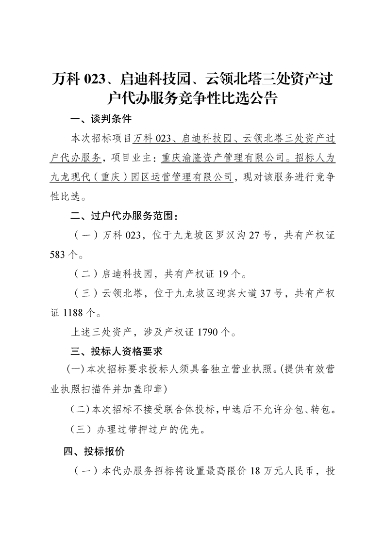 万科023、启迪科技园、云领北塔三处资产过户代办服务竞争性比选公告
