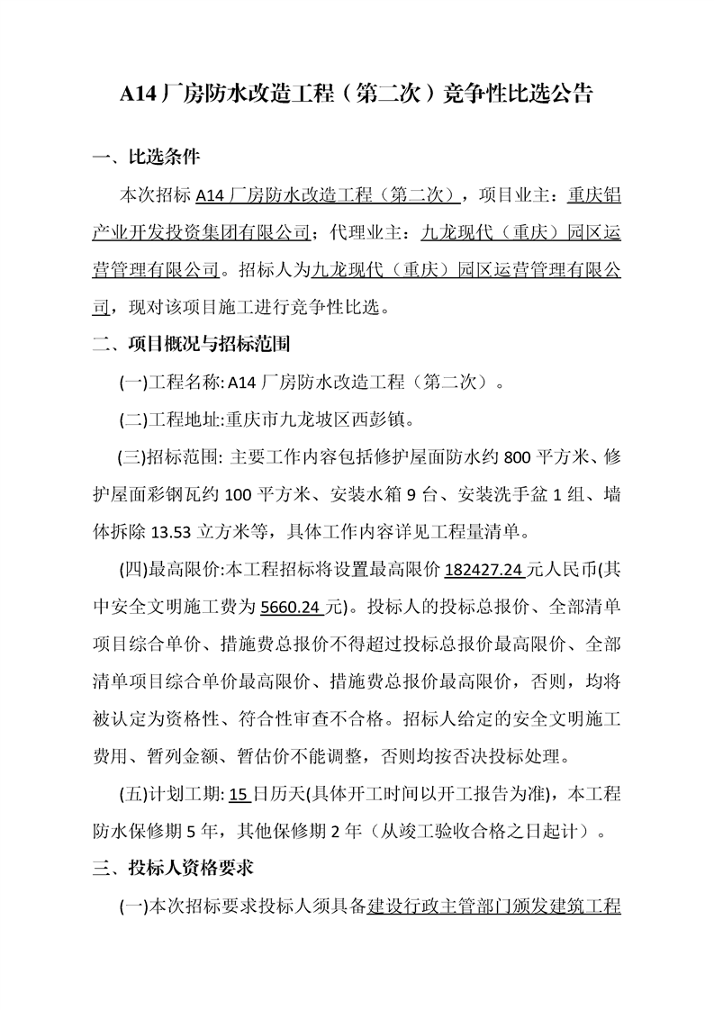 A14厂房防水改造工程(第二次)竞争性比选公告