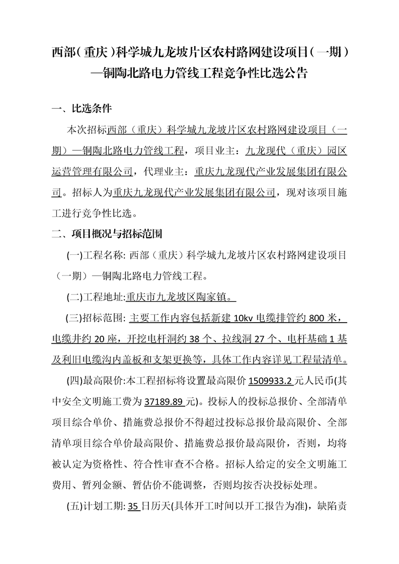 西部(重庆)科学城九龙坡片区农村路网建设项目(一期)—铜陶北路电力管线工程竞争性比选公告