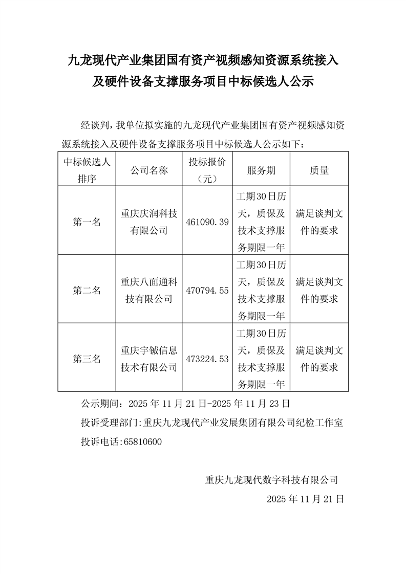 九龙现代产业集团国有资产视频感知资源系统接入及硬件设备支撑服务项目中标候选人公示