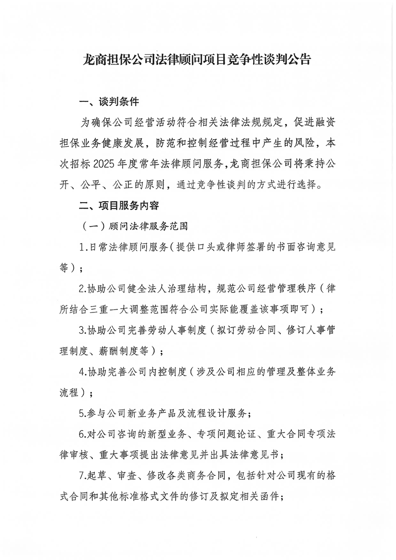 龙商担保公司法律顾问项目竞争性谈判公告