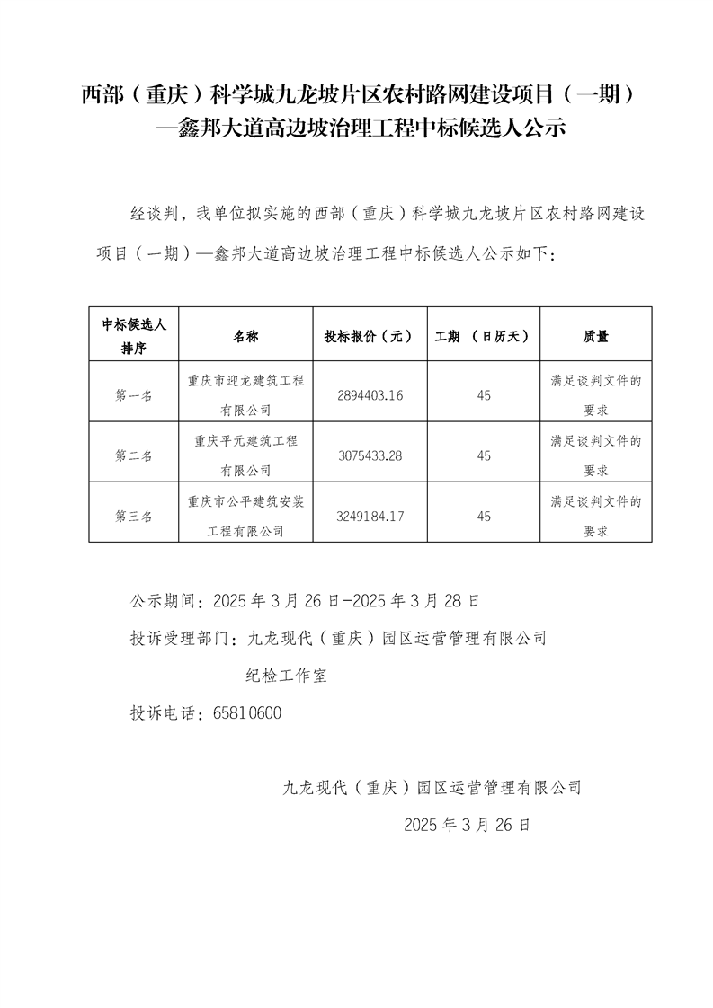 西部(重庆)科学城九龙坡片区农村路网建设项目(一期)—鑫邦大道高边坡治理工程中标候选人公示