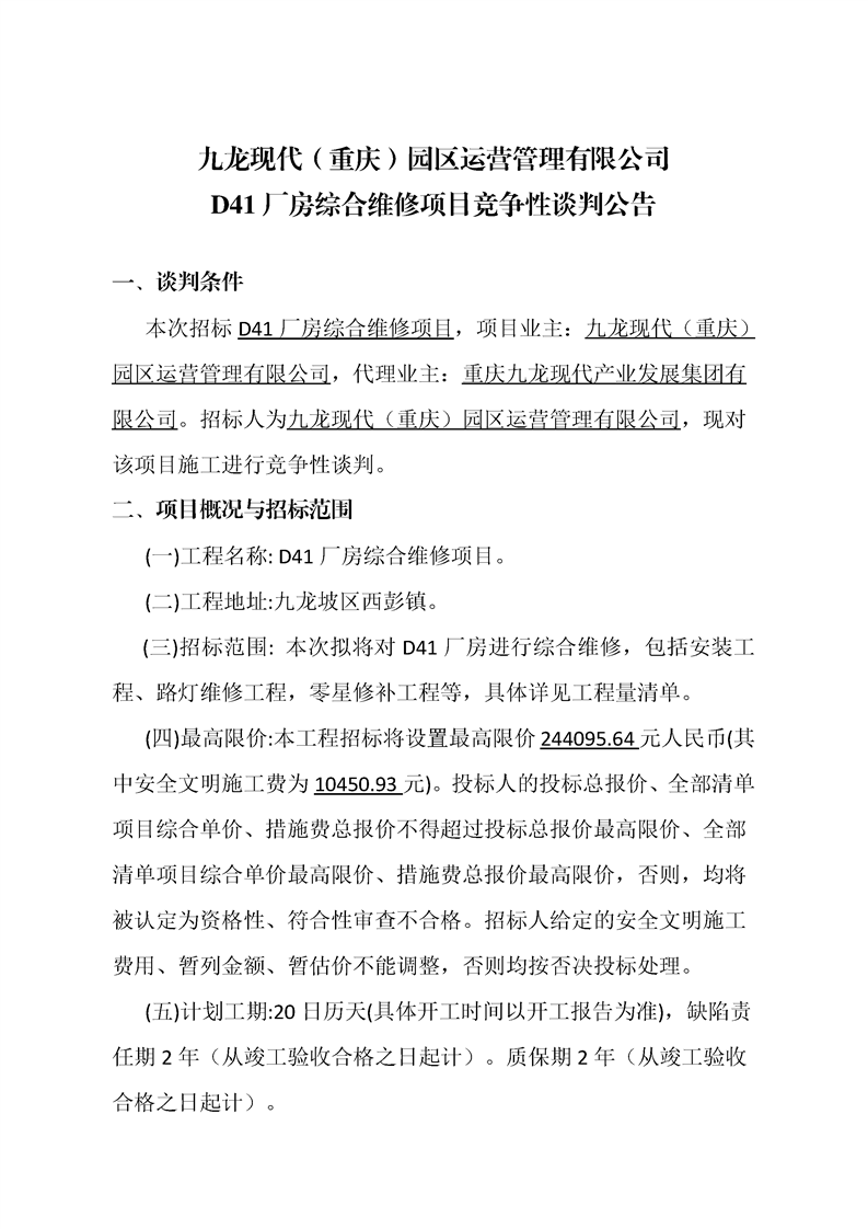 九龙现代(重庆)园区运营管理有限公司D41厂房综合维修项目竞争性谈判公告