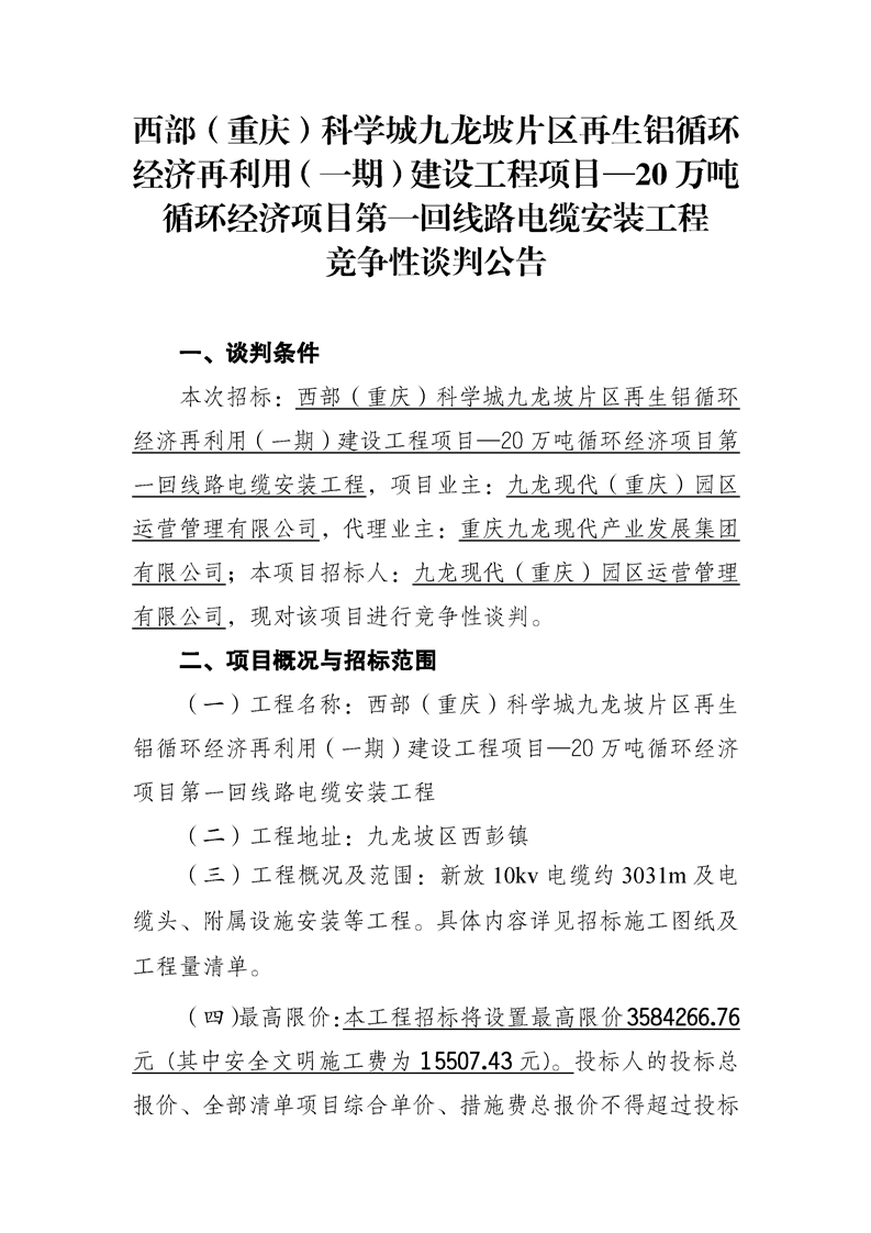 西部(重庆)科学城九龙坡片区再生铝循环经济再利用(一期)建设工程项目—20万吨循环经济项目第一回线路电缆安装工程竞争性谈判公告