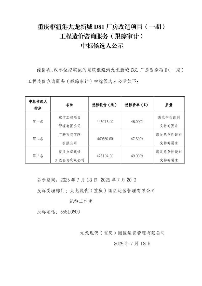 重庆枢纽港九龙新城 D81 厂房改造项目(一期)工程造价咨询服务(跟踪审计)中标候选人公示