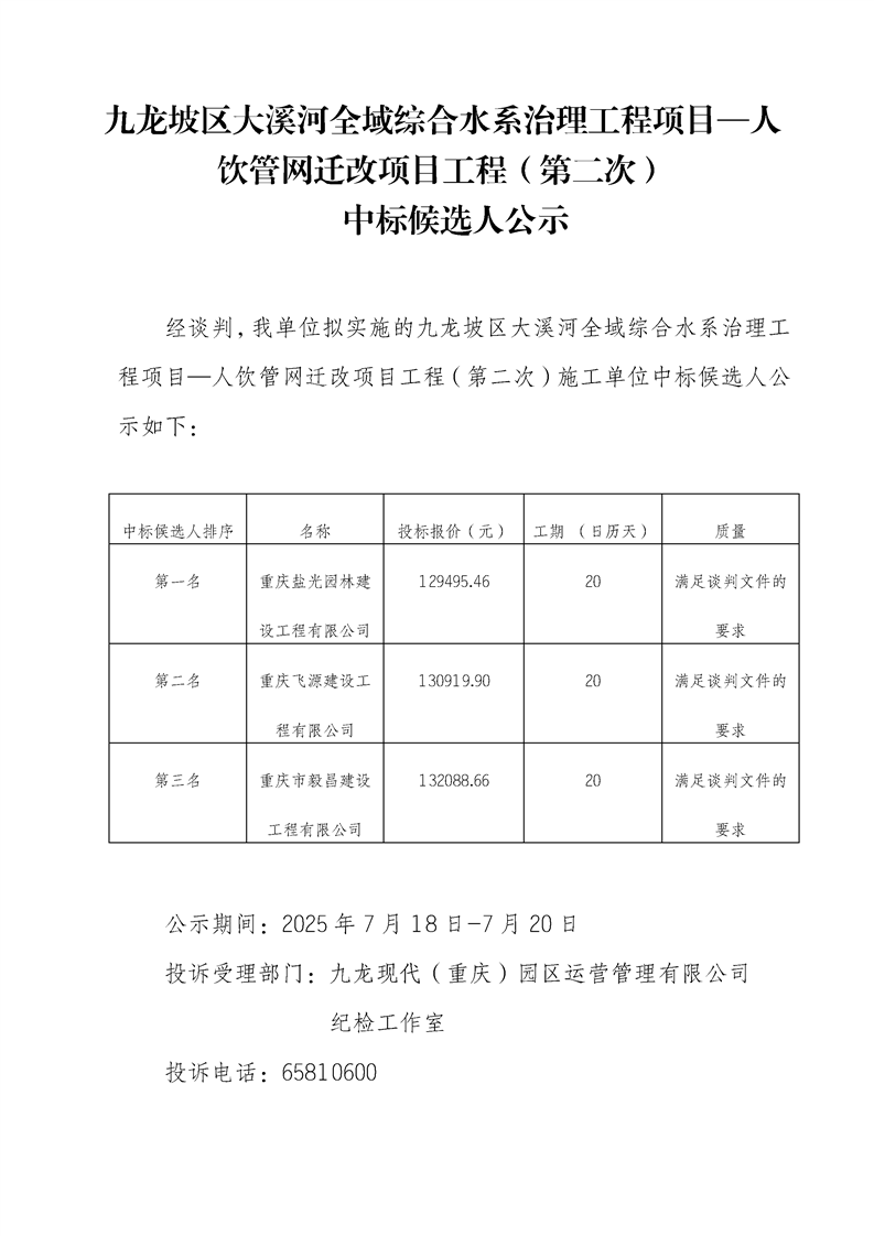 九龙坡区大溪河全域综合水系治理工程项目—人饮管网迁改项目工程(第二次)中标候选人公示
