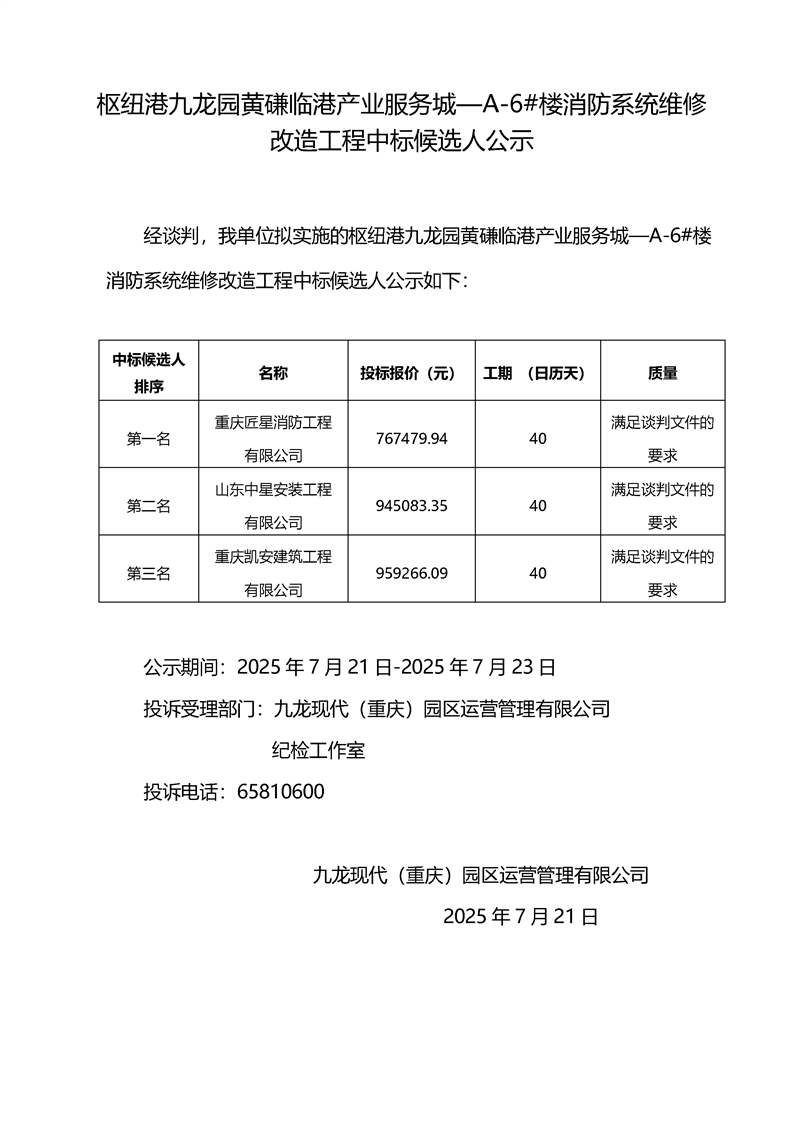 枢纽港九龙园黄磏临港产业服务城—A-6#楼消防系统维修改造工程中标候选人公示