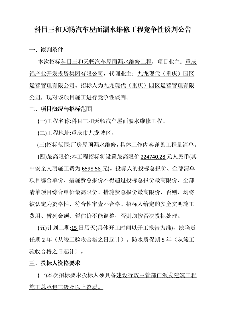 科目三和天畅汽车屋面漏水维修工程竞争性谈判公告附件资料.rar