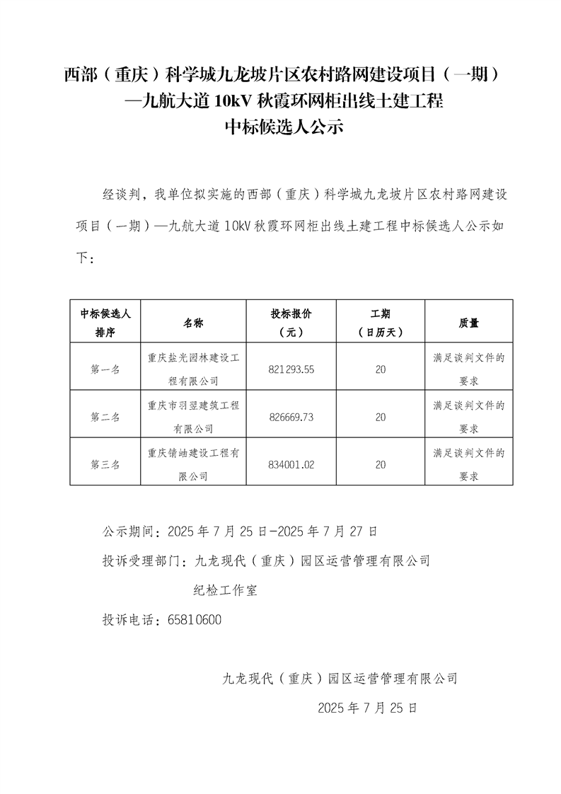 西部(重庆)科学城九龙坡片区农村路网建设项目(一期)—九航大道10kV秋霞环网柜出线土建工程中标候选人公示