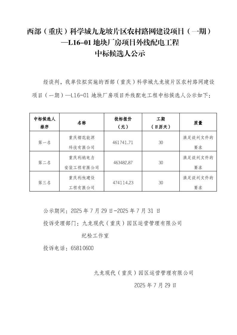 西部(重庆)科学城九龙坡片区农村路网建设项目(一期)—L16-01 地块厂房项目外线配电工程中标候选人公示
