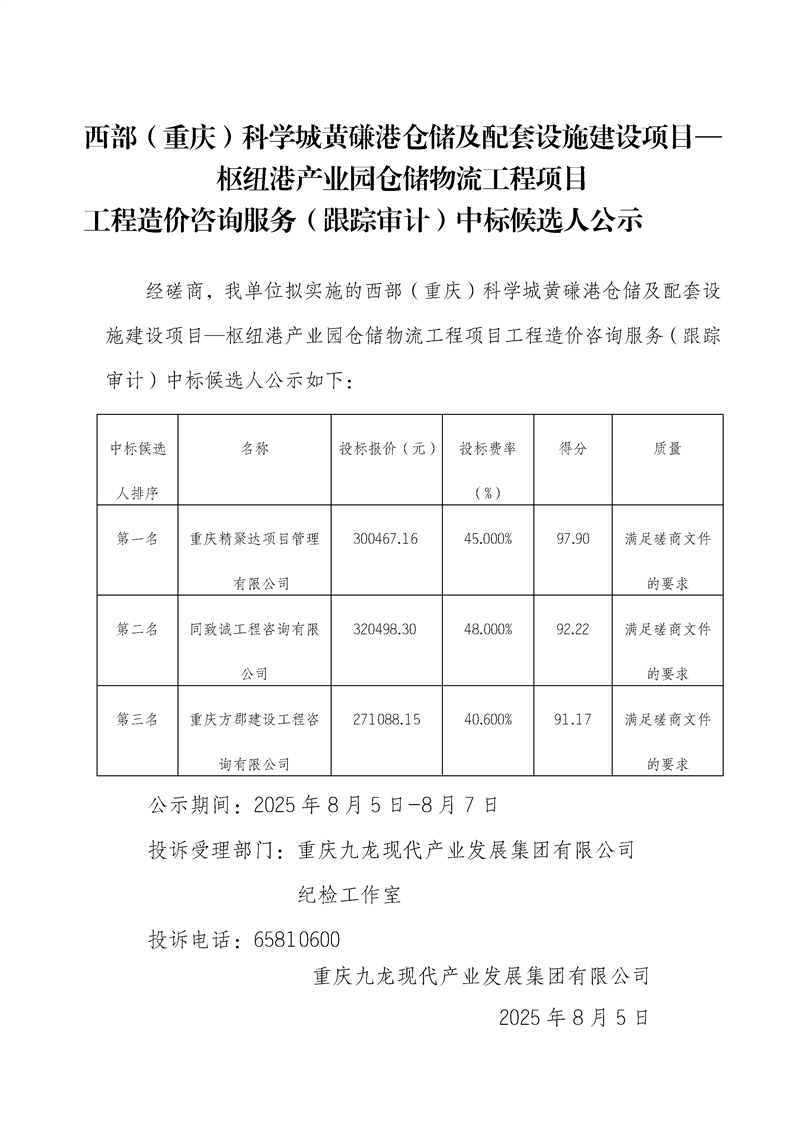 西部(重庆)科学城黄磏港仓储及配套设施建设项目—枢纽港产业园仓储物流工程项目工程造价咨询服务(跟踪审计)中标候选人公示