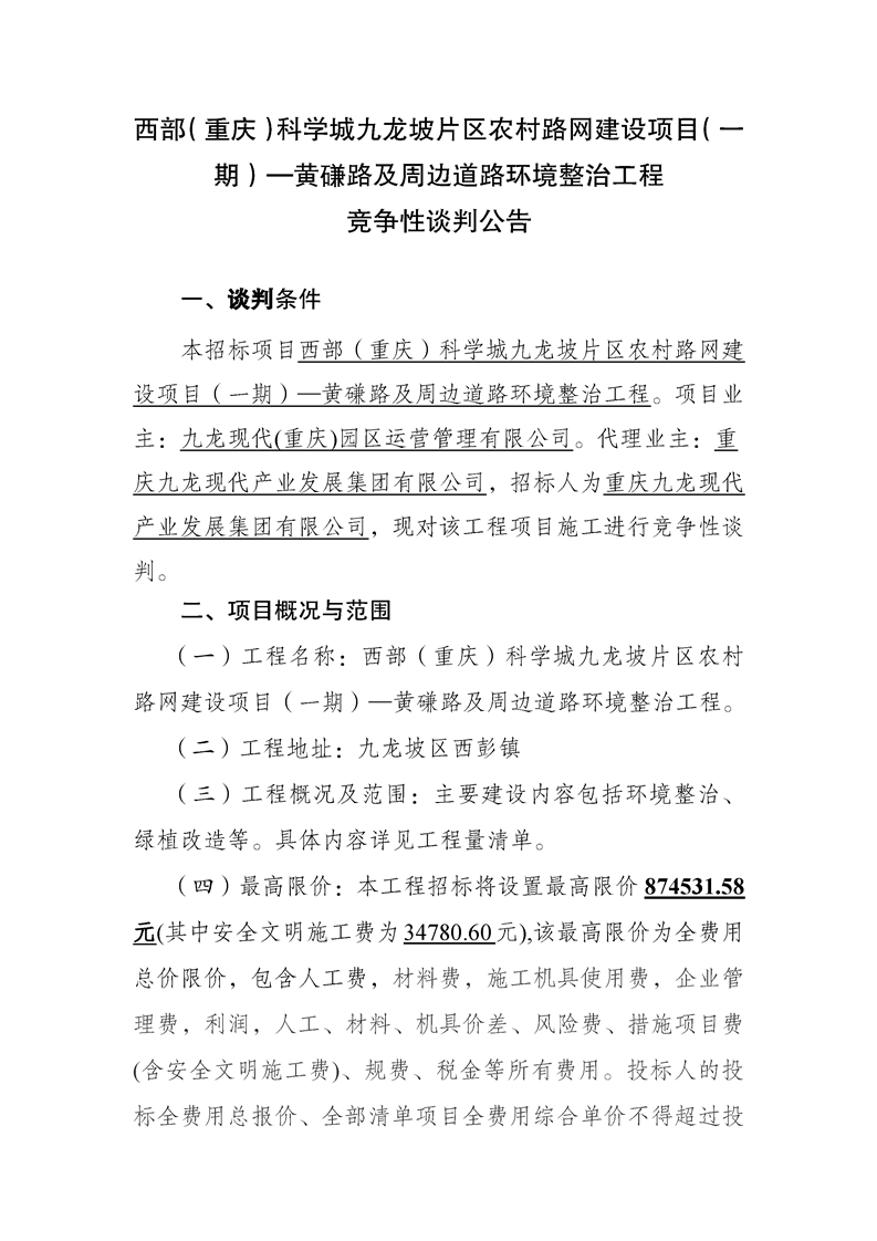 西部(重庆)科学城九龙坡片区农村路网建设项目(一期)—黄磏路及周边道路环境整治工程竞争性谈判公告