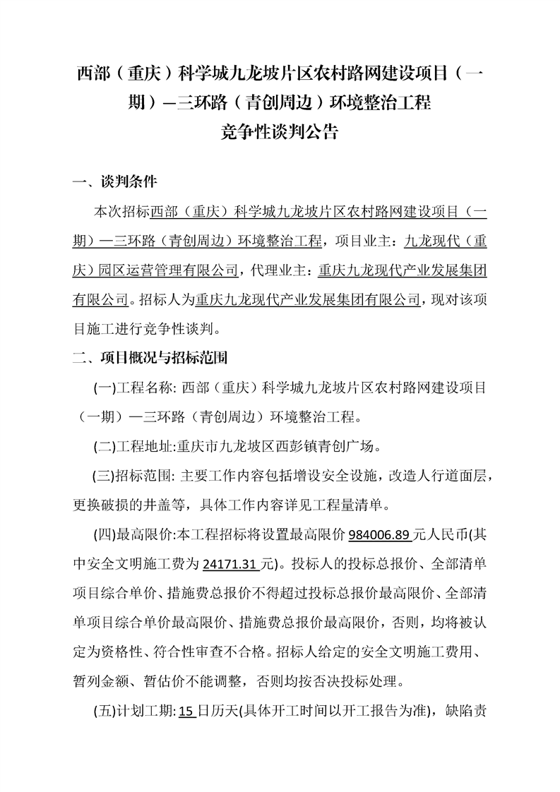 西部(重庆)科学城九龙坡片区农村路网建设项目(一期)—三环路(青创周边)环境整治工程竞争性谈判公告