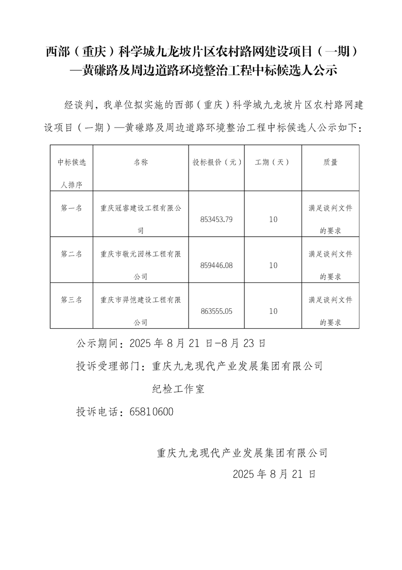 西部(重庆)科学城九龙坡片区农村路网建设项目(一期)—黄磏路及周边道路环境整治工程中标候选人公示