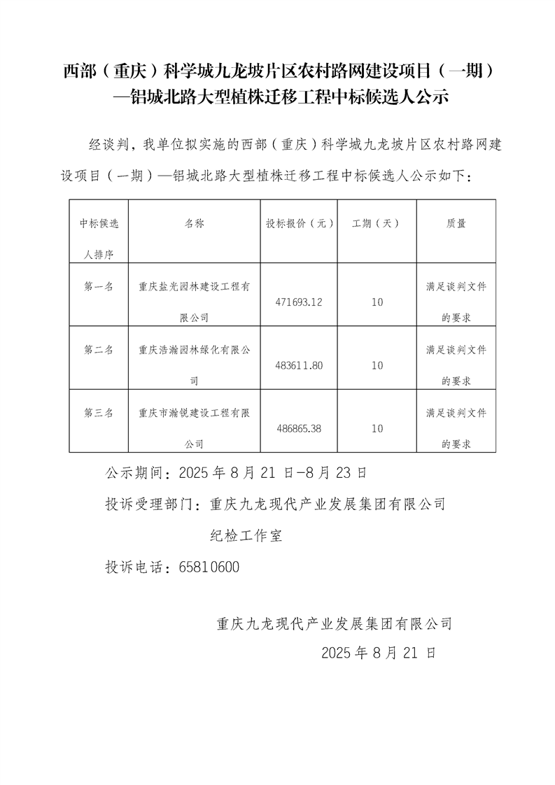 西部(重庆)科学城九龙坡片区农村路网建设项目(一期)—铝城北路大型植株迁移工程中标候选人公示