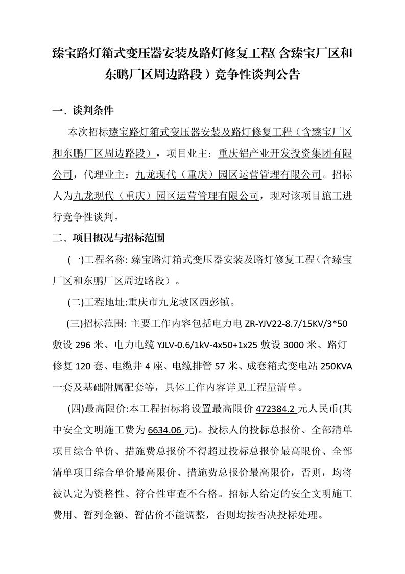臻宝路灯箱式变压器安装及路灯修复工程(含臻宝厂区和东鹏厂区周边路段)竞争性谈判公告