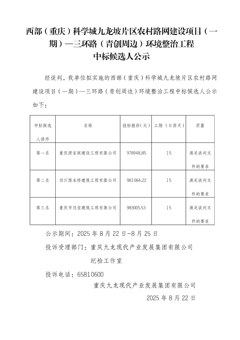 西部(重庆)科学城九龙坡片区农村路网建设项目(一期)—三环路(青创周边)环境整治工程中标候选人公示