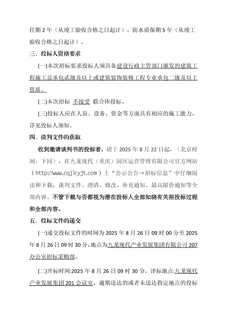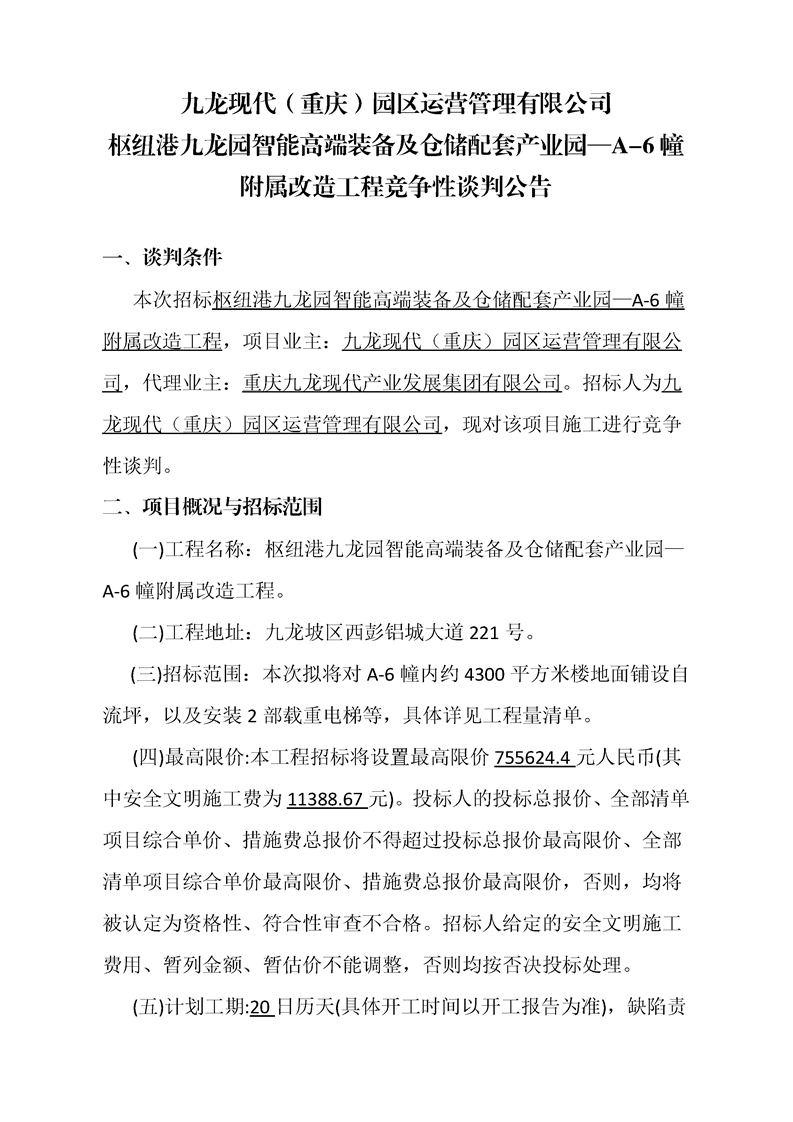 九龙现代(重庆)园区运营管理有限公司枢纽港九龙园智能高端装备及仓储配套产业园—A-6幢附属改造工程竞争性谈判公告