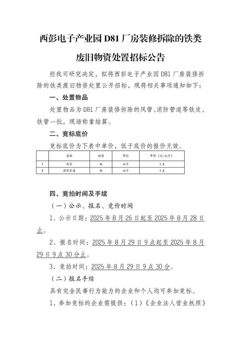 西彭电子产业园D81厂房装修拆除的铁类废旧物资处置招标公告