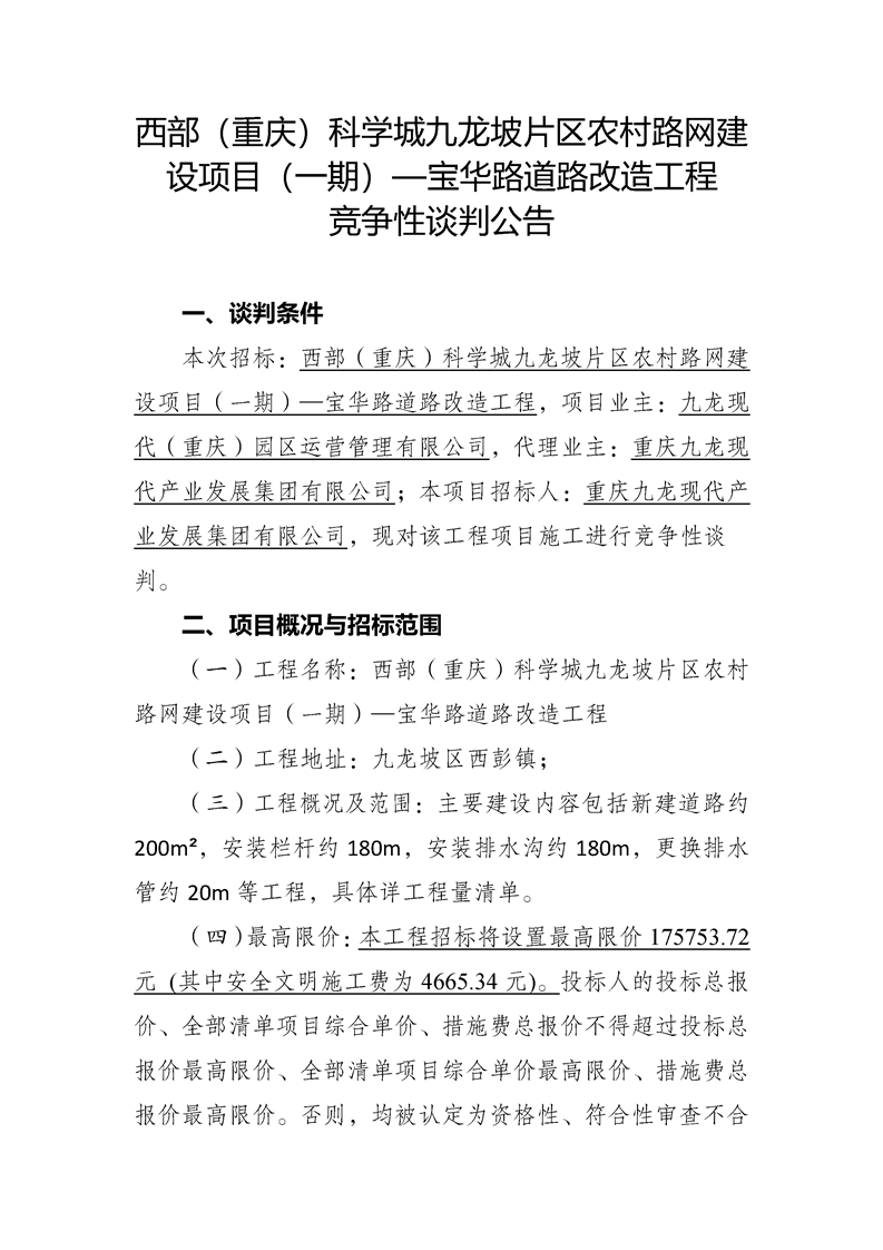 西部(重庆)科学城九龙坡片区农村路网建设项目(一期)—宝华路道路改造工程竞争性谈判公告