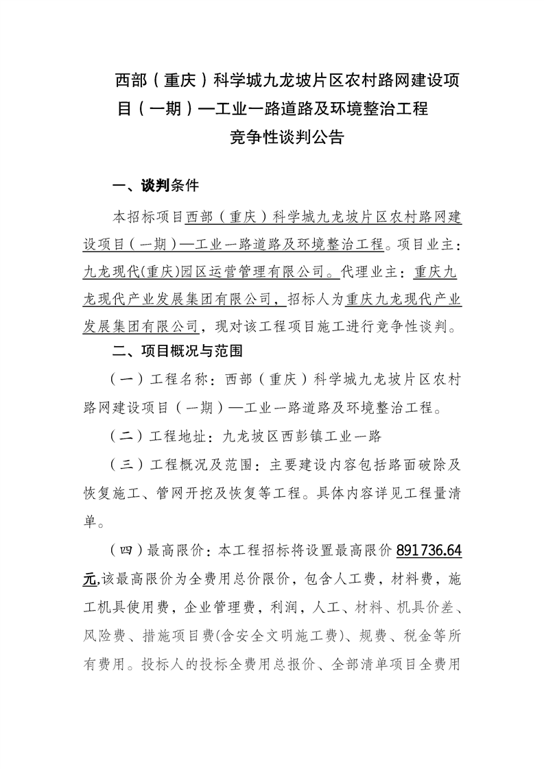 西部(重庆)科学城九龙坡片区农村路网建设项目(一期)—工业一路道路及环境整治工程竞争性谈判公告