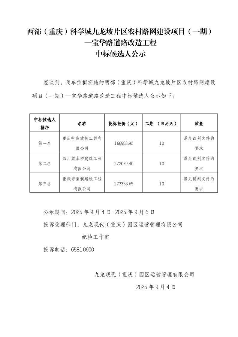 西部(重庆)科学城九龙坡片区农村路网建设项目(一期)—宝华路道路改造工程中标候选人公示