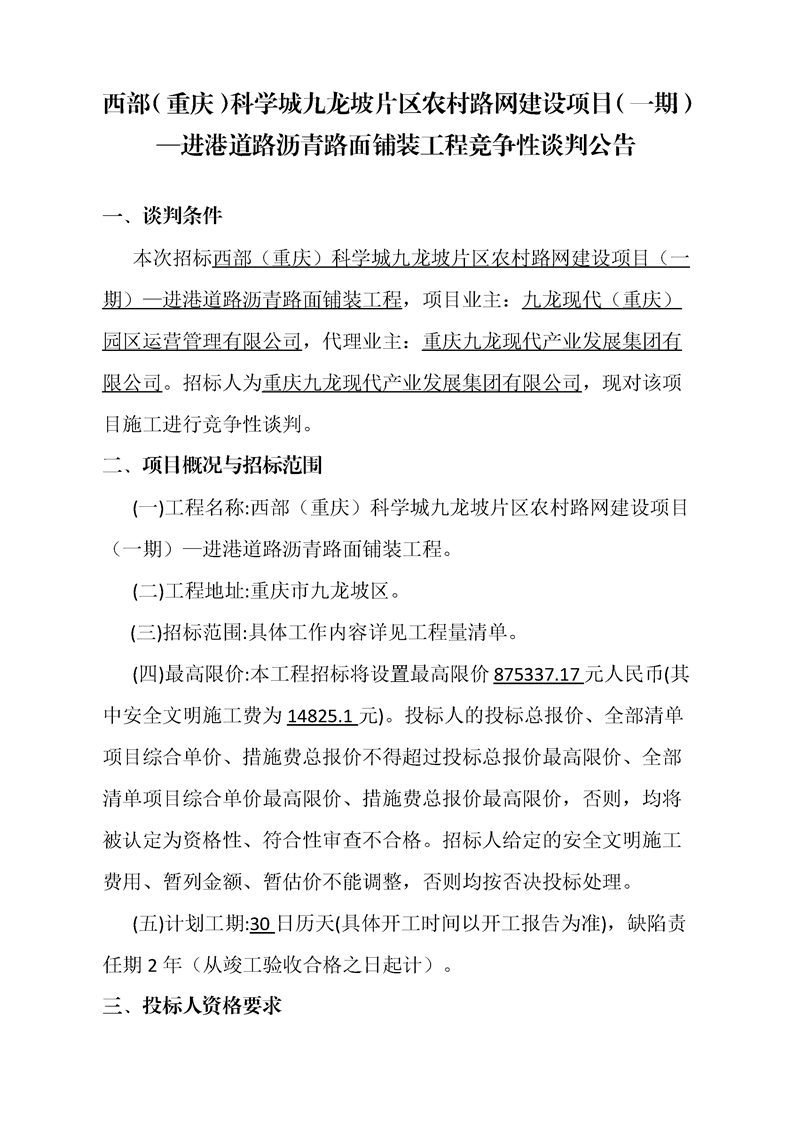 西部(重庆)科学城九龙坡片区农村路网建设项目(一期)—进港道路沥青路面铺装工程竞争性谈判公告