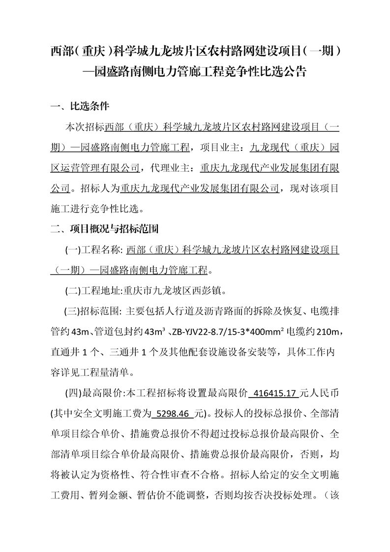 西部(重庆)科学城九龙坡片区农村路网建设项目(一期)—园盛路南侧电力管廊工程竞争性比选公告