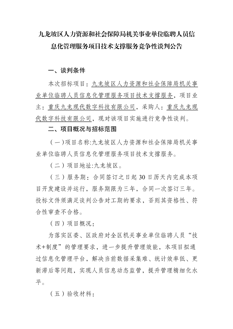 九龙坡区人力资源和社会保障局机关事业单位临聘人员信息化管理服务项目技术支撑服务竞争性谈判公告