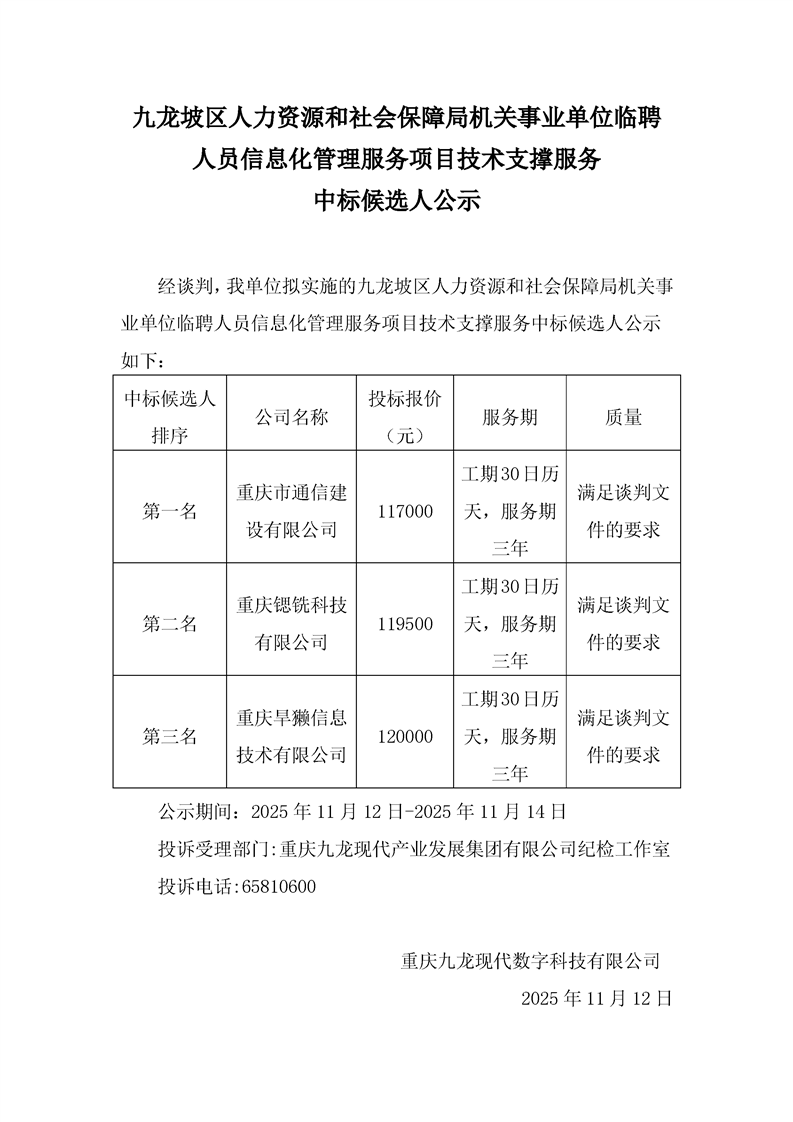 九龙坡区人力资源和社会保障局机关事业单位临聘人员信息化管理服务项目技术支撑服务中标候选人公示
