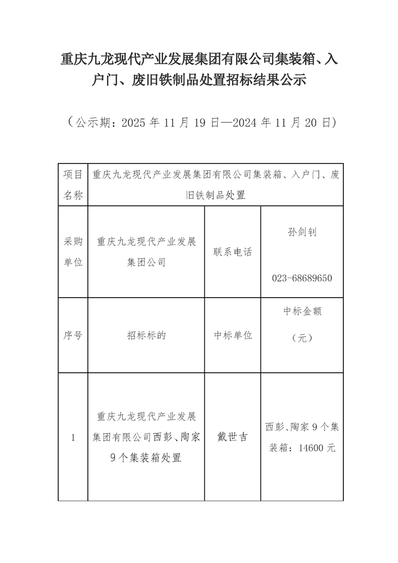 重庆九龙现代产业发展集团有限公司集装箱、入户门、废旧铁制品处置招标结果公示