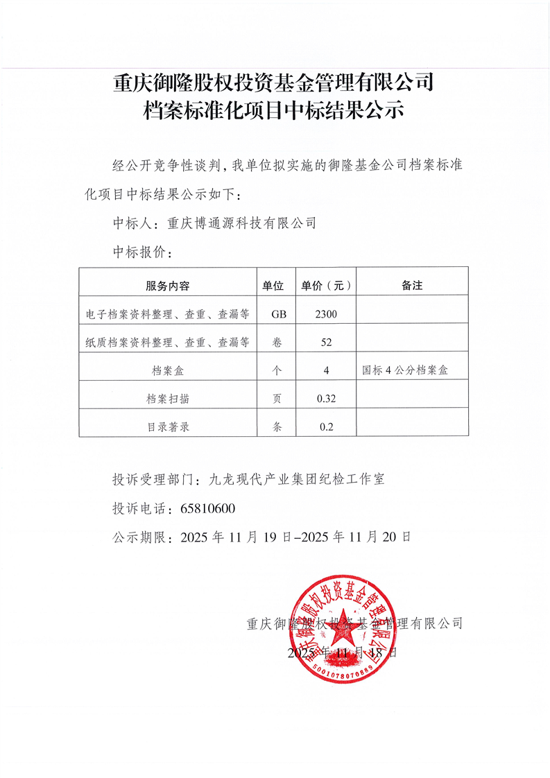重庆御隆股权投资基金管理有限公司档案标准化项目中标结果公示