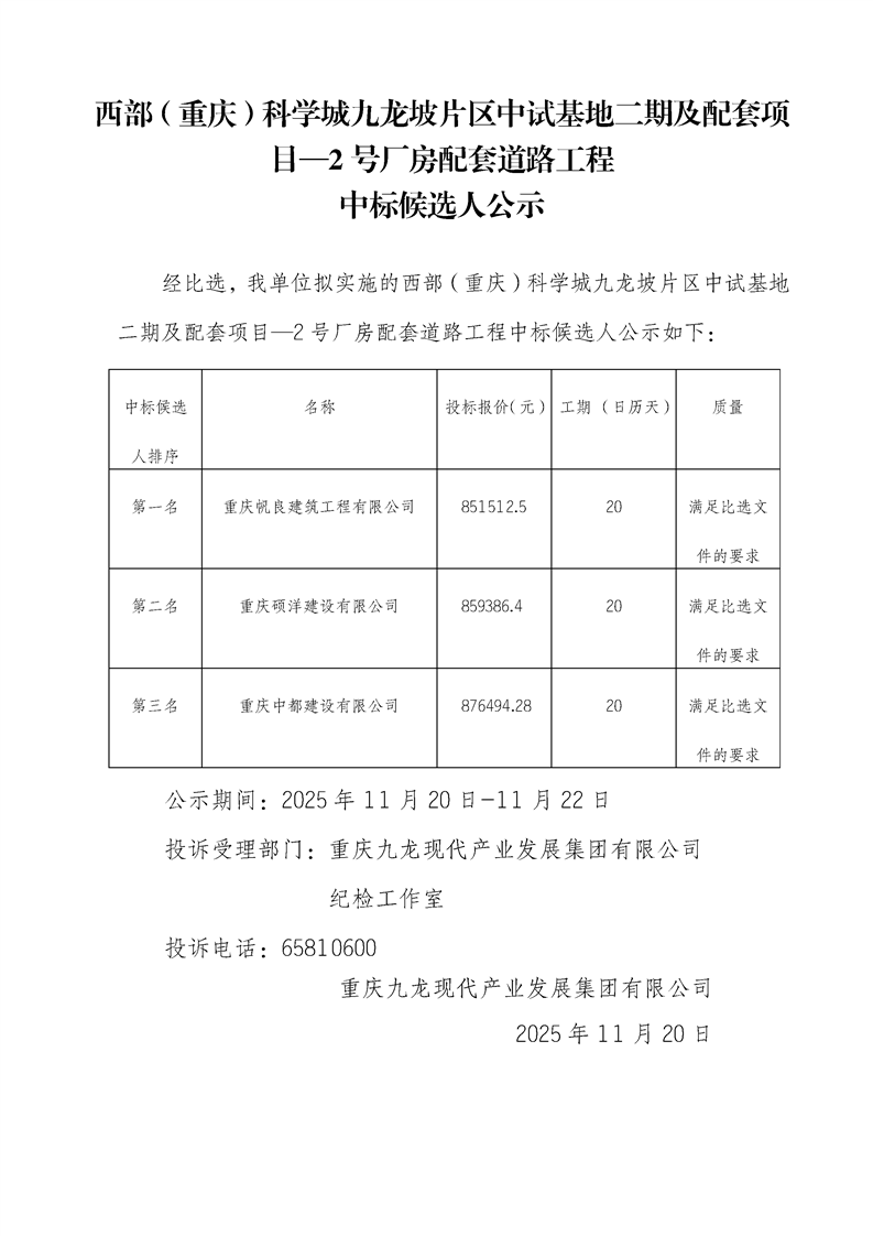 西部(重庆)科学城九龙坡片区中试基地二期及配套项目—2号厂房配套道路工程中标候选人公示