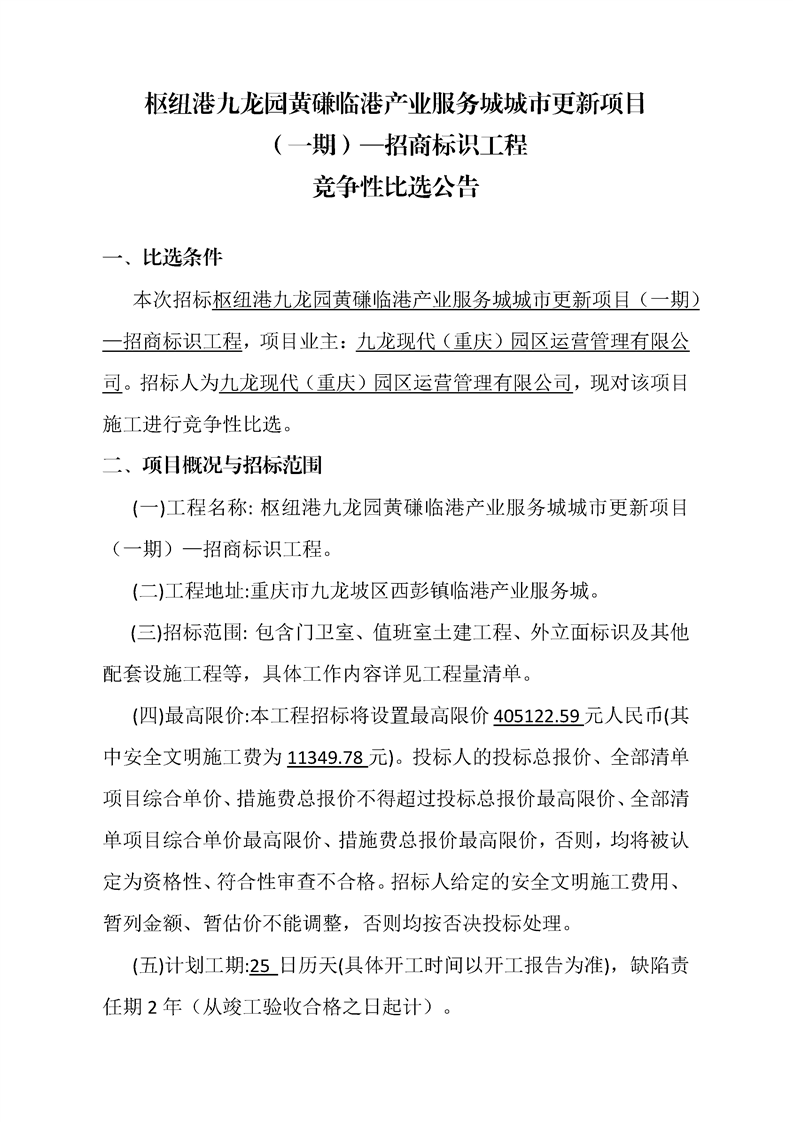 枢纽港九龙园黄磏临港产业服务城城市更新项目(一期)—招商标识工程竞争性比选公告
