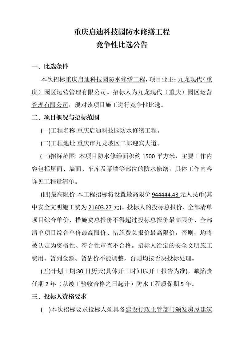 重庆启迪科技园防水修缮工程竞争性比选公告
