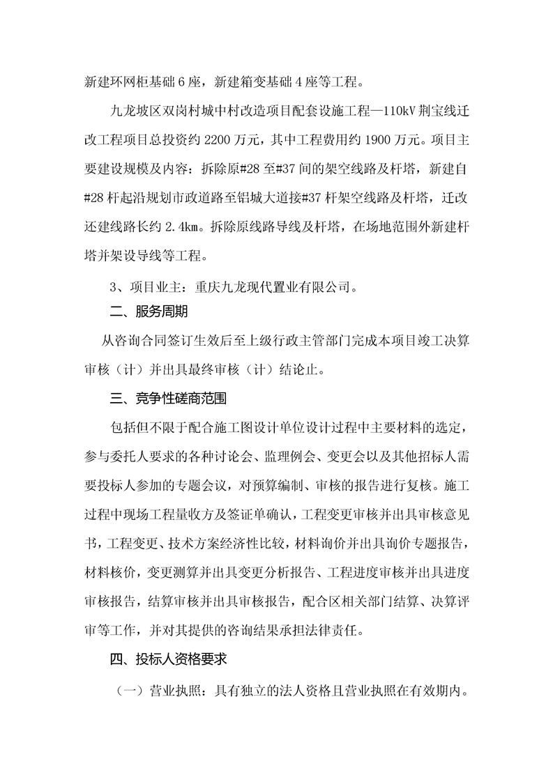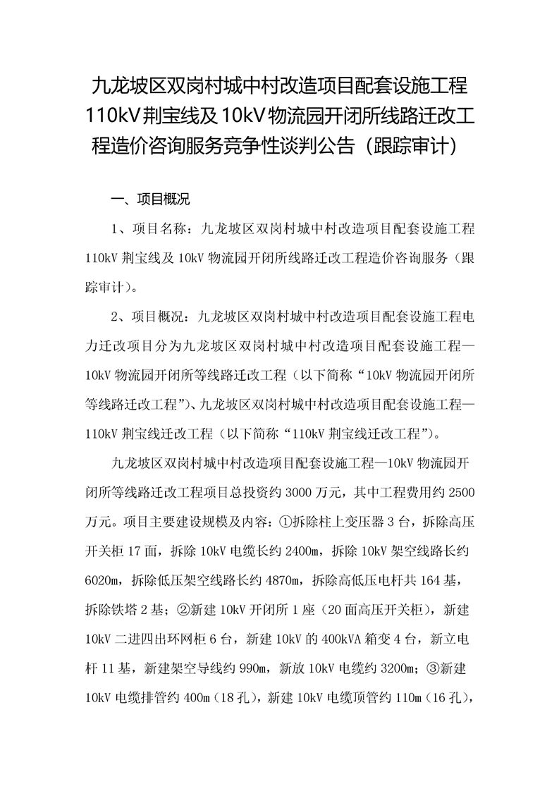 九龙坡区双岗村城中村改造项目配套设施工程110kV荆宝线及10kV物流园开闭所线路迁改工程造价咨询服务竞争性谈判公告(跟踪审计)