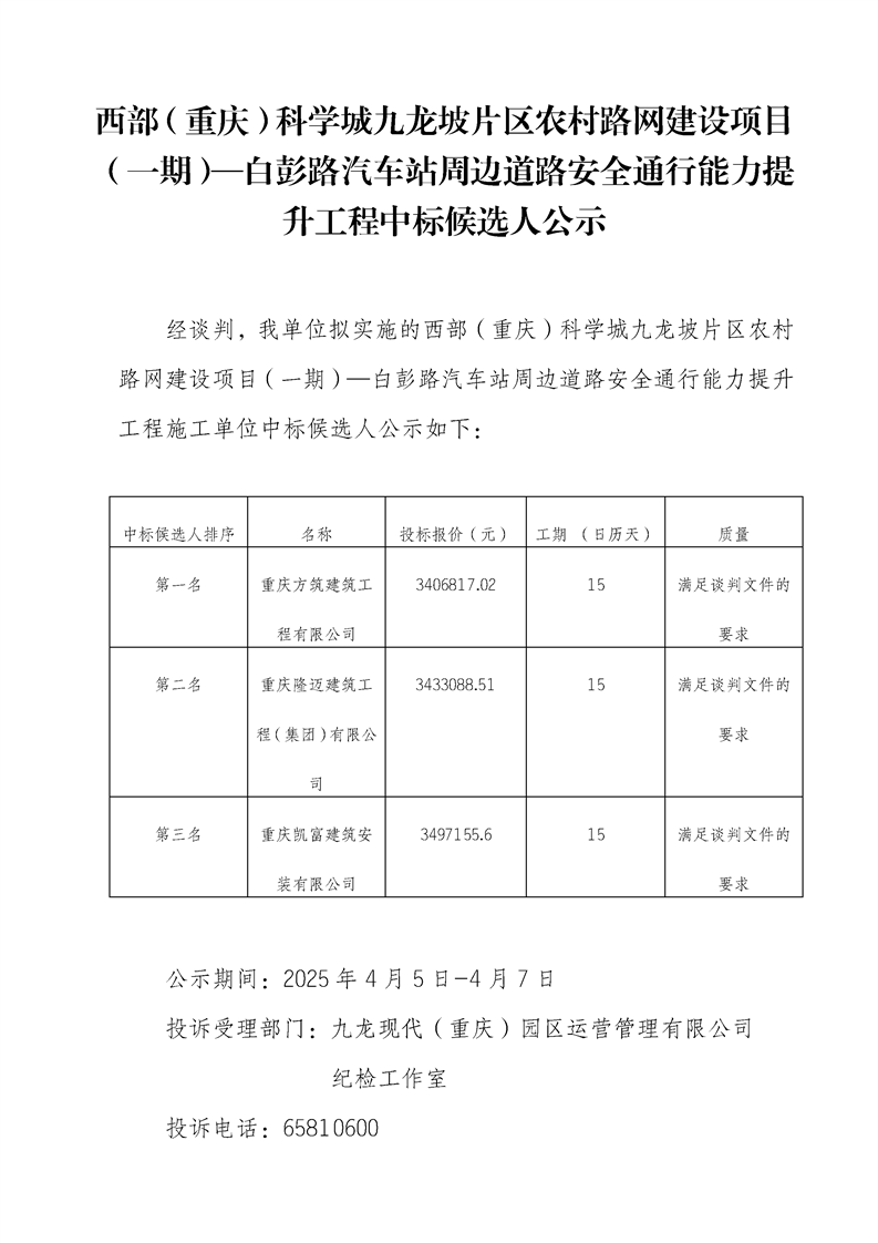 西部(重庆)科学城九龙坡片区农村路网建设项目(一期)—白彭路汽车站周边道路安全通行能力提升工程中标候选人公示