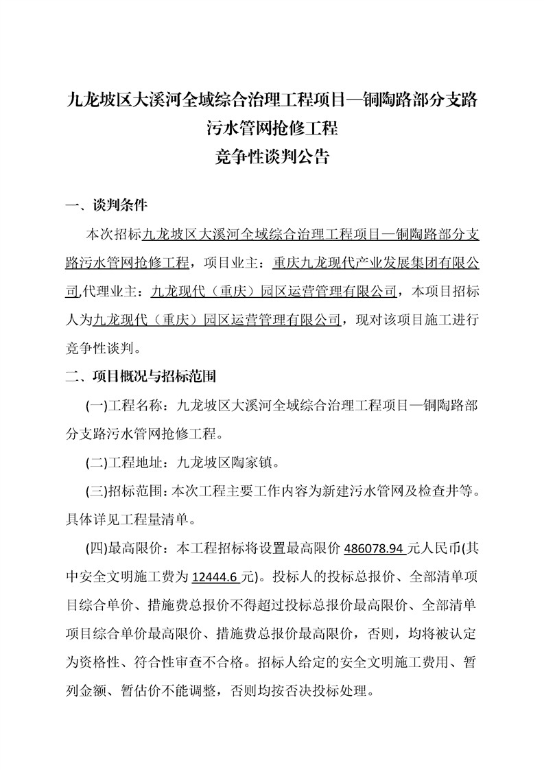 竞争性谈判公告--九龙坡区大溪河全域综合治理工程项目—铜陶路部分支路污水管网抢修工程附件资料.rar