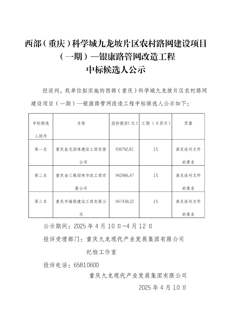 西部(重庆)科学城九龙坡片区农村路网建设项目(一期)—银康路管网改造工程中标候选人公示