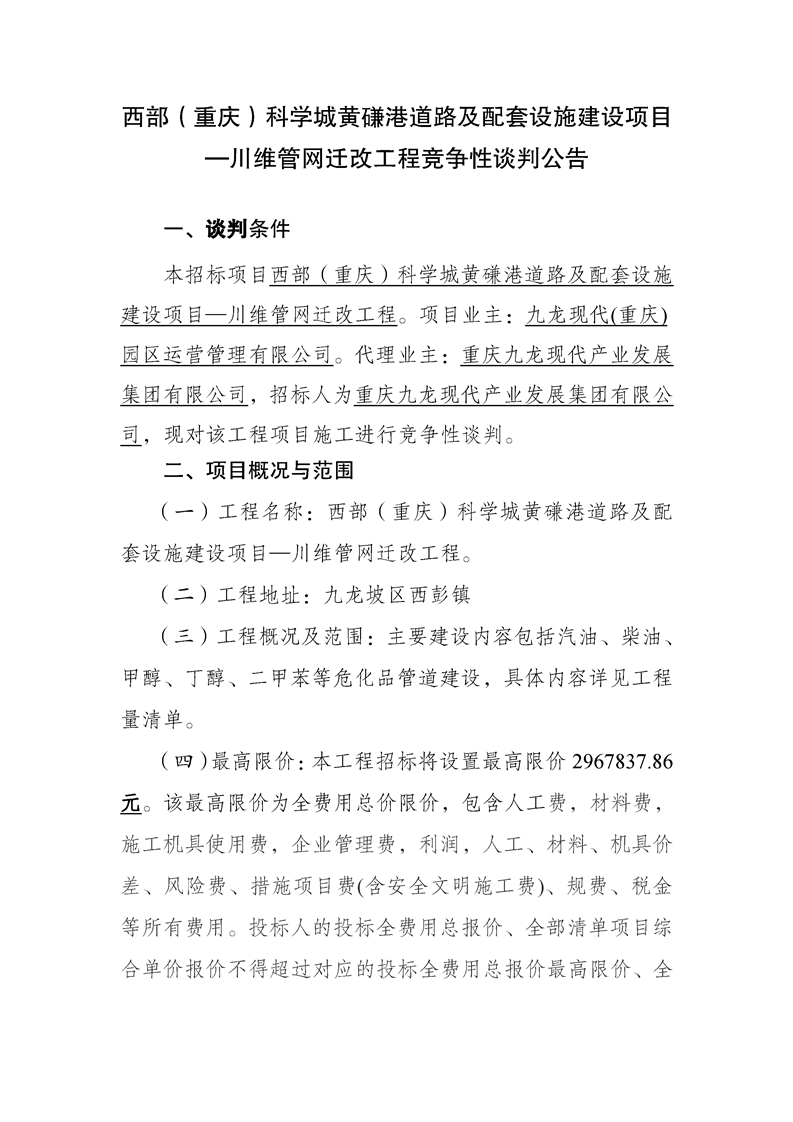 西部(重庆)科学城黄磏港道路及配套设施建设项目—川维管网迁改工程竞争性谈判公告