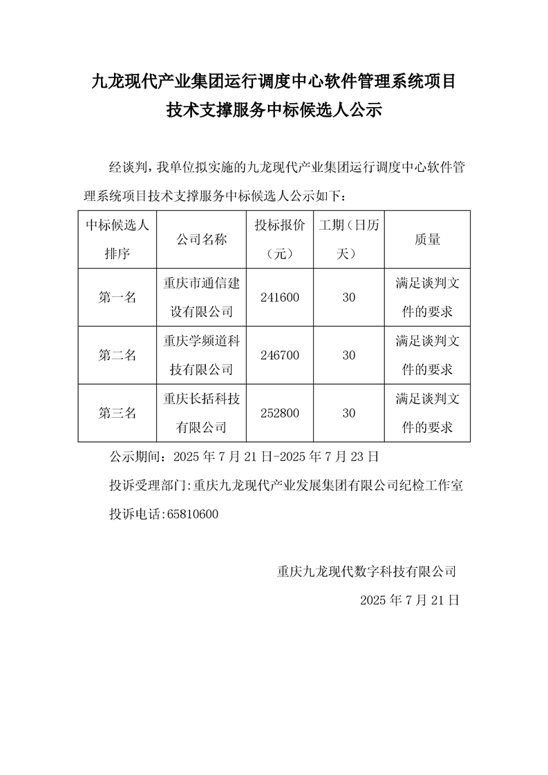 九龙现代产业集团运行调度中心软件管理系统项目技术支撑服务中标候选人公示